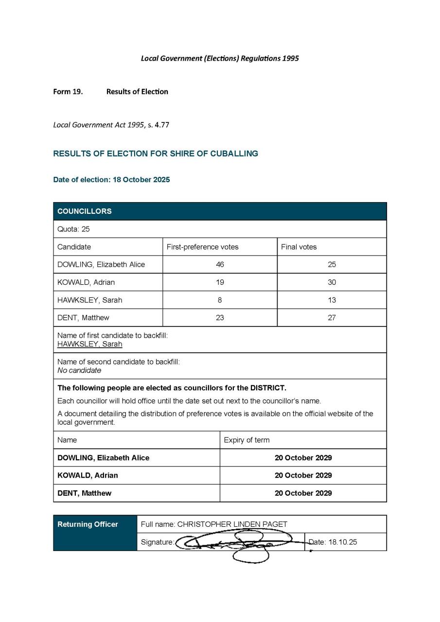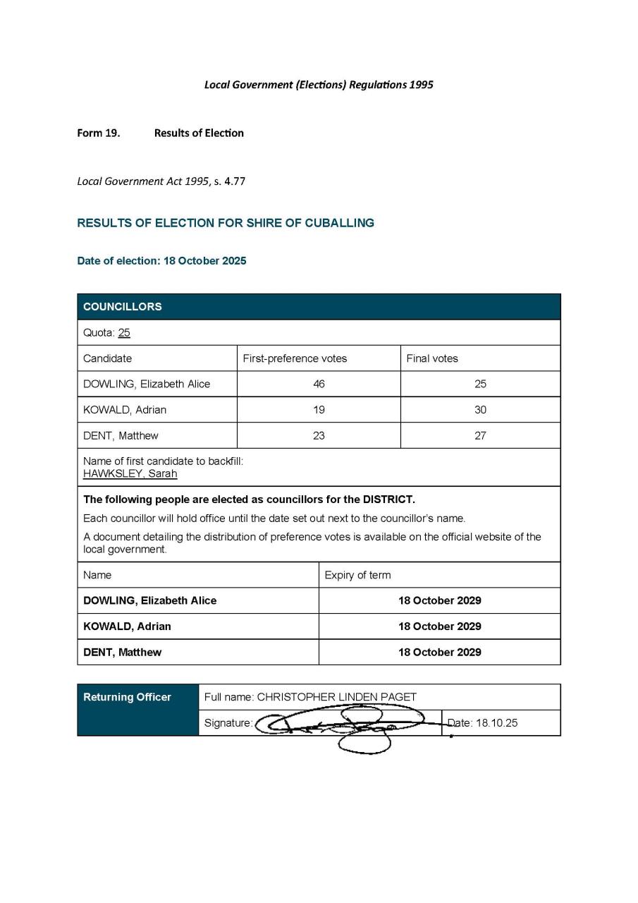 RESULTS OF ELECTION FOR SHIRE OF CUBALLING
